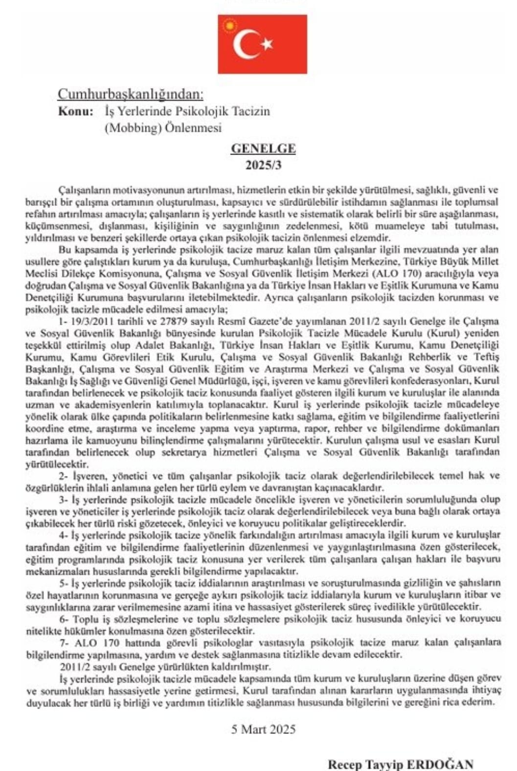 Mobbing Eğitim Yardım Araştırma Derneği olarak, iş yerlerinde psikolojik tacizin (mobbing) önlenmesine yönelik uzun süredir sürdürdüğümüz çabaların önemli bir sonucu olarak, Sayın Cumhurbaşkanımız Recep Tayyip Erdoğan tarafından imzalanarak yürürlüğe giren 2025/3 sayılı “İş Yerlerinde Psikolojik Tacizin Önlenmesi” Genelgesini büyük bir memnuniyetle karşılıyoruz.